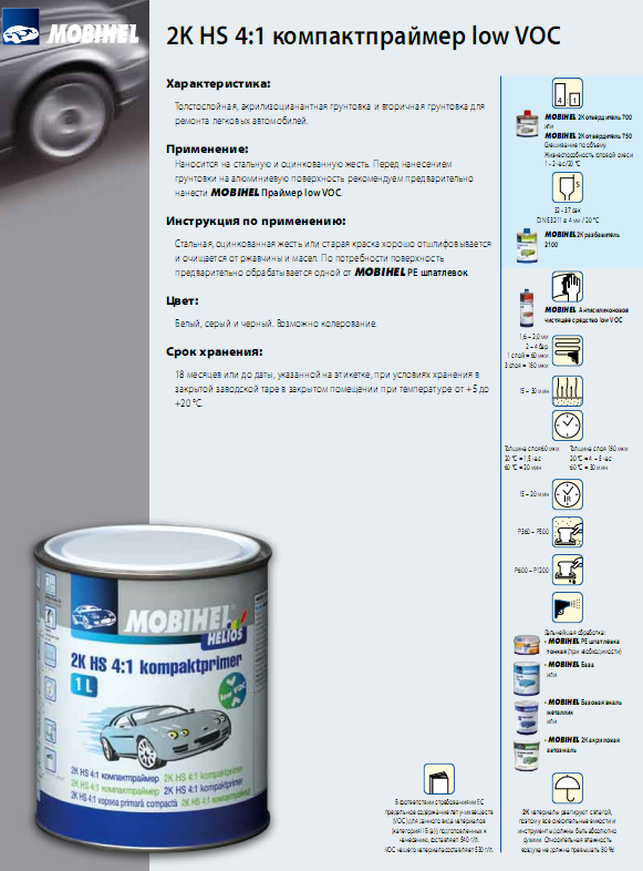 Грунт акриловий Mobihel HS 4+1 чорний -товстослойне, акрил-изоцианантное покриття використовується в якості грунтовки і вторинної грунтовки для обробки поверхні легкових автомобілів.